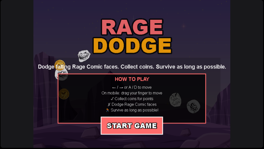 Control a $RAGE face and dodge falling Rage Comic faces. Survive as long as possible. Difficulty increases over time.