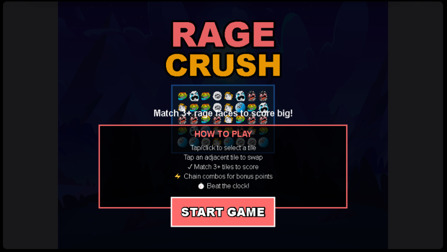 Match 3+ rage faces to score big! Swap tiles, create combos, and beat the clock. Candy Crush-style match-3 arcade action.