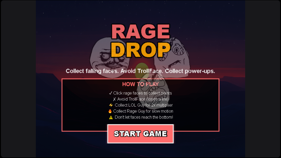 Control a $RAGE face and dodge falling Rage Comic faces. Survive as long as possible. Difficulty increases over time.