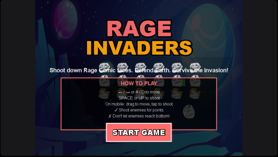 Shoot down Rage Comic faces in this Space Invaders-style game. Defend Earth and survive the invasion!